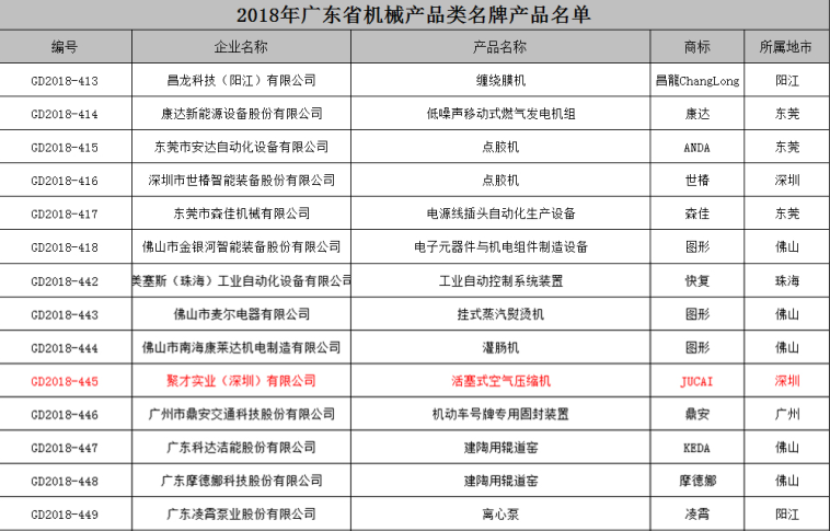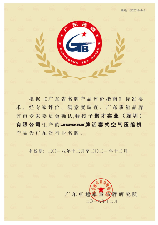 喜訊——根據(jù)《廣東省名牌產(chǎn)品評(píng)價(jià)指南》標(biāo)準(zhǔn)要求,在企業(yè)自愿申報(bào)的基礎(chǔ)上,經(jīng)申報(bào)資料初審、審報(bào)數(shù)據(jù)公示、企業(yè)現(xiàn)場(chǎng)審查、專家綜合評(píng)價(jià)、廣東質(zhì)量品牌評(píng)審專家委員會(huì)審議確認(rèn),授予聚才實(shí)業(yè)(深圳)有限公司生產(chǎn)的“JUCAI聚才”牌活塞式空氣壓縮機(jī)等系列產(chǎn)品為2018年度廣東省行業(yè)類名牌,有效期三年。